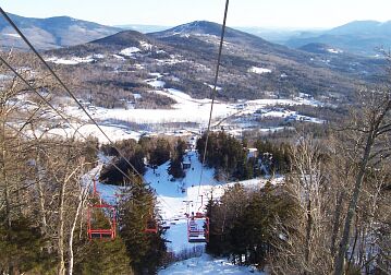 The Summit Double Chair is a Meuller fixed-grip double with Riblet Chairs, painted red. The ride is smooth as silk, and because the summit terrain is somewhat tougher than the lower mountain, it is seldom slowed or stopped for novices with loading troubles. Midstation is certainly an option; be advised that it's a fairly steep ramp that can give pause to some novices. There is usually no line at the Summit Double; even during peak holiday periods it only backs up 4 or 5 skiers at most.