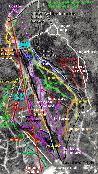 Trail map based on Terraserver image. This is not as artistic as the official trail map, but it does show the trails with more accuracy. Some trails shown but not named on this representation are: • Carter Notch Glades, depicted off Upper Maple Slalom in orange and yellow • Sun Valley, shown as a short green line along the red Summit Double liftline • Down Under, runs along the black East Bowl Triple liftline. • Lo Road, shown as a yellow and red line next to East Bowl. • Little Dipper, shown as a red line off Big Dipper. • Quick Way, shown as a yellow and red line connecting Lower Speedwell to Big Dipper. • Raceway, which is shown as an extension of the S-Turns trail. Trails and chutes that may be visible but are not depicted due to space limitations include Bat Cave, Zip, Sweet, Dew Drop, Down & Out, Breezeway, Black Diamond, No Turning Back, and others. | |||