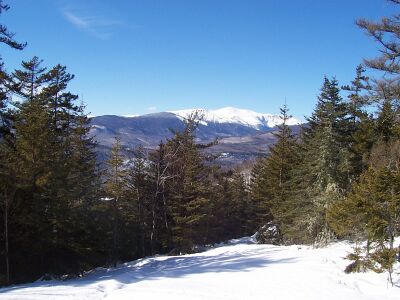Goose Pitch | East Side | ![]() | Rolling intermediate cruiser, collects traffic from Juniper and Galloping Goose, and feeds them into a "pitch" that gives most novices pause. Then goes on to collect traffic from Runaway, feeds into Raceway or Lower Black Beauty. Other than the pitch, this would be easy pickings for novices. Opens early in the season, and is usually always groomed.![]() View down Goose Pitch from the end of Galloping Goose. The trail seems to disappear; that's the "pitch." Attitash is visible in the distance. |